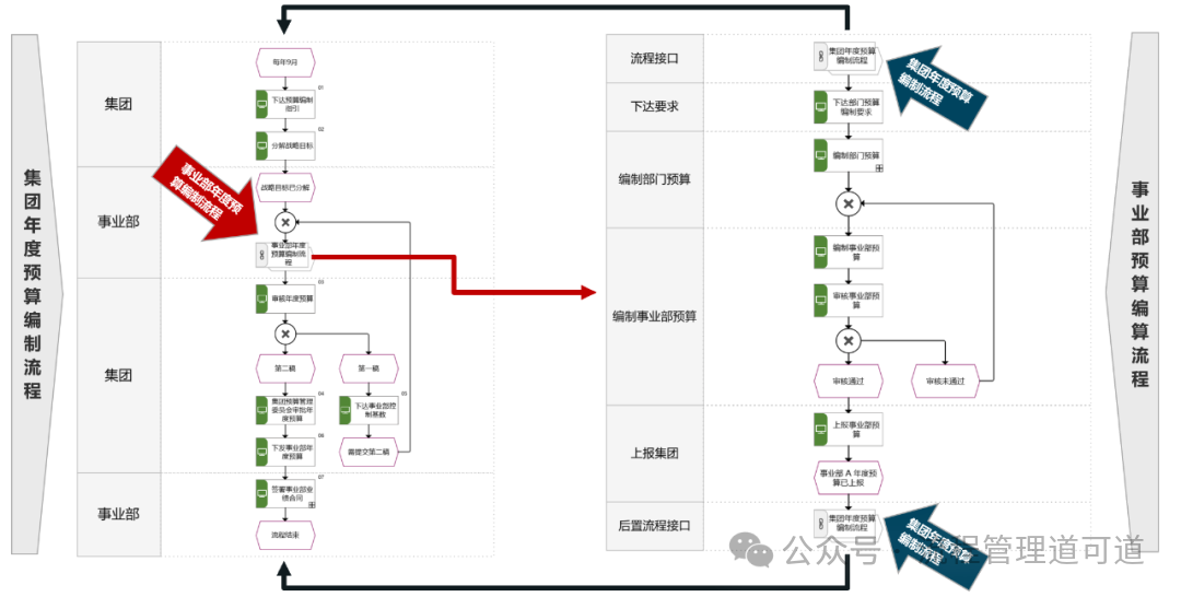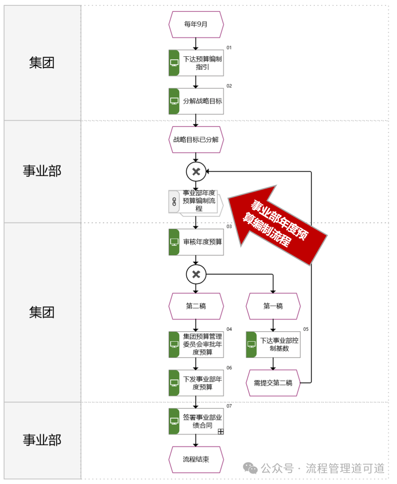 如上图所示,【L5 活动: 集团年度预算编制流程图】中间有一个流程接口,调用了【L4 子流程: 事业部年度预算编制流程】。【L5 活动: 集团年度预算编制流程图】体现了预算编制 “上下结合,两上两下” 的模式。