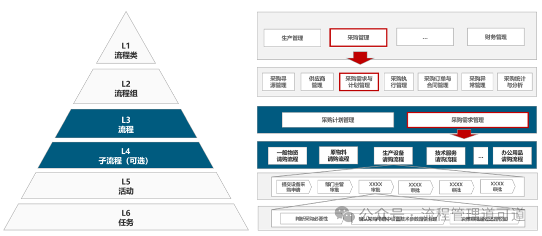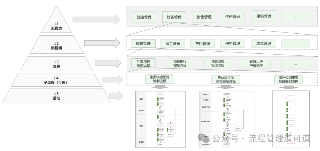 在上图所示的流程分层框架中:L1流程类【财务管理】下 L2流程组 【预算管理】 下有一条 L3流程 【年度预算编制流程】,这条流程存在多种场景,且不能用相同流程支撑运作,所以把【L3流程: 年度预算编制流程】 进行了适当的细分,得到三条子流程,分别是: