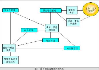 能力管理流程包括业务能力管理、服务能力管理和资源能力管理三个子流程,其中业务能力管理子流程主要关注当前及未来的业务需求,服务能力管理子流程主要关注当前IT服务的品质是否能够支持正常的业务运作,而资源能力管理子流程主要关注所有服务提供赖以进行的技术基础,确保IT基础设施中所有组件能发挥最大的效能。这五个流程之间的关系如图3所示。