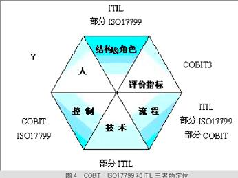 普华永道曾在2002年7月份发布一个研究报告,提出一个统一的框架定位这三个标准。该报告认为,为了战略整合信息技术和业务、提高服务质量和效率、降低服务成本和控制安全,企业应当重点关注人、流程、技术、结构和角色、评价指标和控制等6个方面。从这6个方面来考察,COBIT、ISO17799和ITIL之间的定位如图4所示。