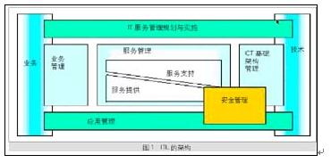 ITIL整个架构是由6个模块构成的,即业务管理(Business Perspective)、服务管理、ICT基础架构管理(ICT Infrastructure Management)、IT服务管理规划与实施(Planning to Implement IT Service Management)、应用管理(Application Management)和安全管理,如图1所示。这六个模块的含义以及它们之间的关系分别介绍如下: