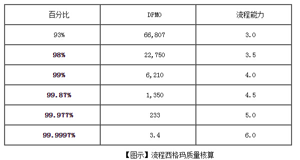 那么,既然已经有了百万差错率和产出百分比这样的度量标准,为什么还要用其他的标准,如流程西格玛系数呢?首先,流程西格玛是比百分率更敏感的指示器。当 流程西格玛超过4西格玛水平时,我们看到4.5流程西格玛水平于99.87%的产出率相对应,5.0西格玛质量水平与99.97%的产出率相对应。一个 0.5西格玛的增长需要一个0.107%的产出率增加。而从5.0西格玛增长到6.0西格玛,其产出率增加仅为0.0227%。西格玛系数让企业可以描述 达到近乎完美结果的流程。