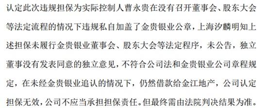 1月26日,金贵银业回复了深交所,称曹永贵私自利用上市公司名义为关联方违规提供担保,上海汐麟明知担保未履行法定程序仍借款给金江地产,公司认定担保无效,但最终仍需法院判决为准。