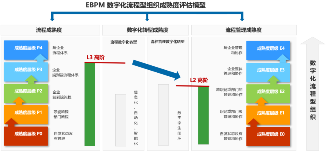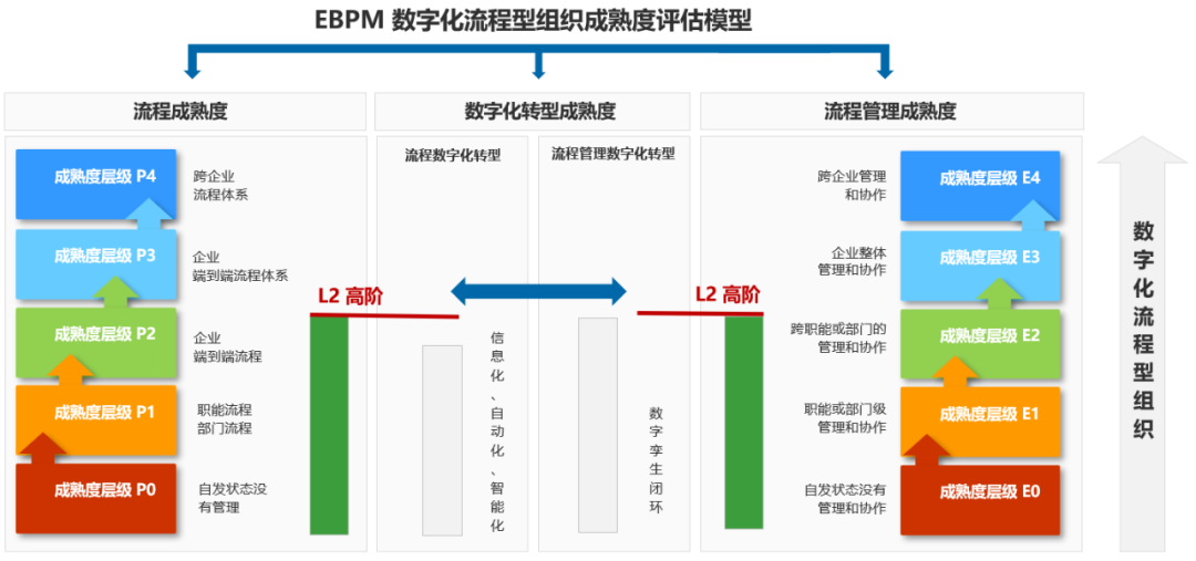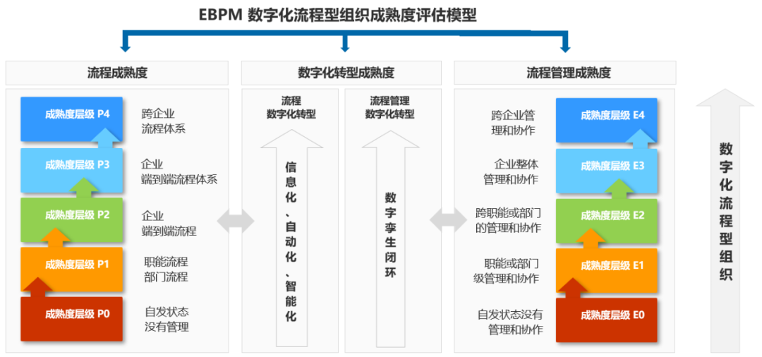 如上图所示,《EBPM 数字化流程型组织成熟度评估模型》由<流程成熟度>、<流程管理成熟度>和<数字化转型成熟度>三个主维度构成。这三个主维度的成熟度越高,企业数字化流程型组织的成熟度就越高。