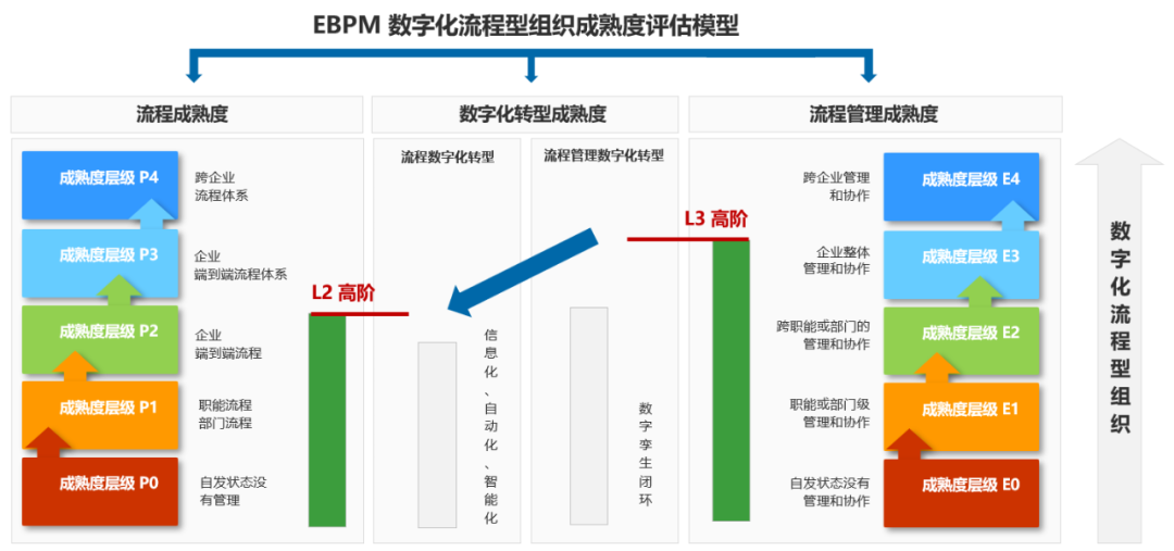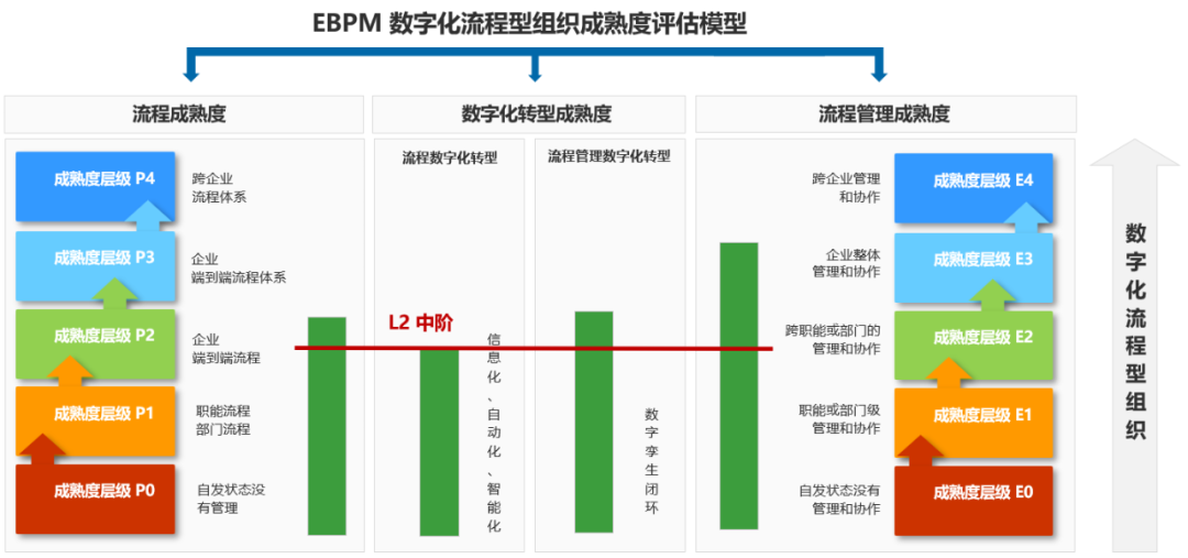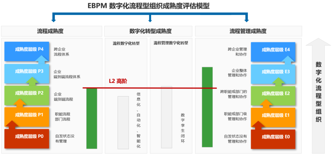 整个企业的《数字化流程型组织成熟度》等级,由上述四个评估分值中最低的一个决定。比如,上图所示样例中,该企业<流程数字化转型成熟度>在四个评估等级中最低,是