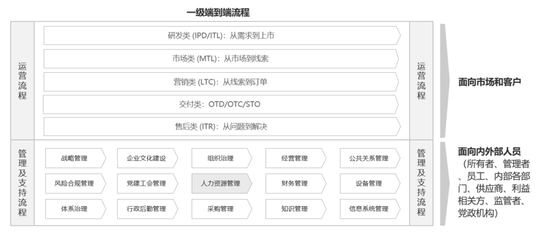 如上图所示,企业不仅成功构建了面向市场和客户的运营类核心端到端流程,而且还构建了面向内外部人员的管理及支持类端到端流程,即企业构建了完整的<端到端流程架构>。此时,企业的流程成熟度就正式迈入 L3 级。当然,所谓构建完成,不仅仅是指构建了<端到端流程架构>和<端到端流程图>模型,同时还需要就哈默教授给出的5 类 13 个能动因素进行全面评估,才能得出是否构建成功的结论。