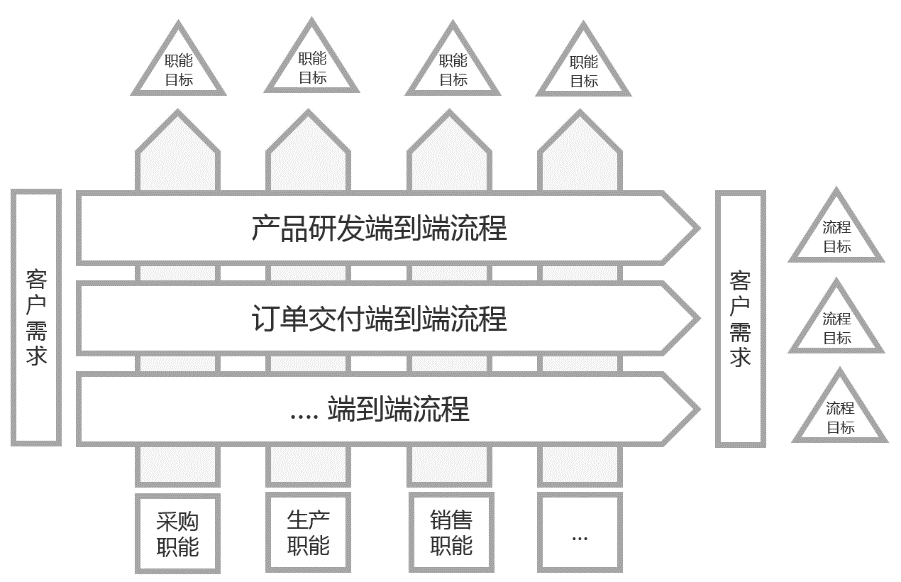如上图所示,我们的企业是一个分工协作型的组织,按不同的职能分工建立相应的职能部门,再通过各职能部门间的相互协作来完成某项具体的工作。而企业各专业团队间协同工作的过程,就是不同“职能流程”前后接力,完成某一具体工作的过程,这个过程称之为“端到端流程”。