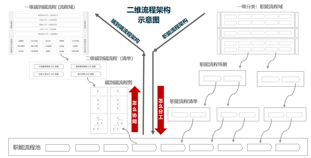 如上图所示,“端到端流程”由“职能流程”前后串联而成。梳理“端到端流程”,要求企业突破传统的职能视角,从只关注于本职能一亩三分地的效益转换到关注企业整体运营的效果,即实现从局部到全局的视角转换。