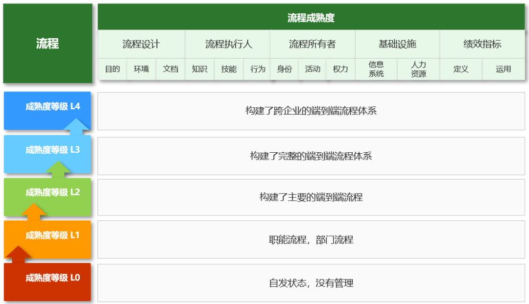 下面,我们说明一下L0-L4级所代表的具体意涵及“端到端流程”这个概念在判断企业流程处于哪个成熟度等级中所起的作用。