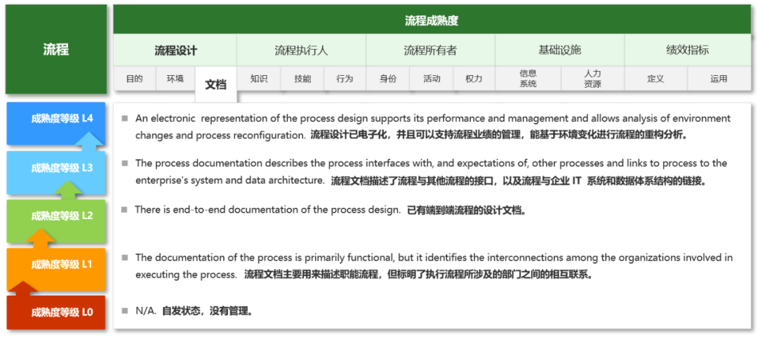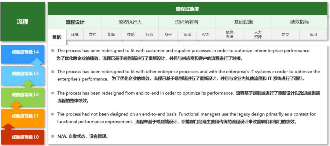 流程设计是哈默教授 5 类 13 个能动因素中的第一个维度,包括:目的、环境、文档 3 个能动因素,以下是这 3 个能动因素各级成熟度标准的中英文版定义。