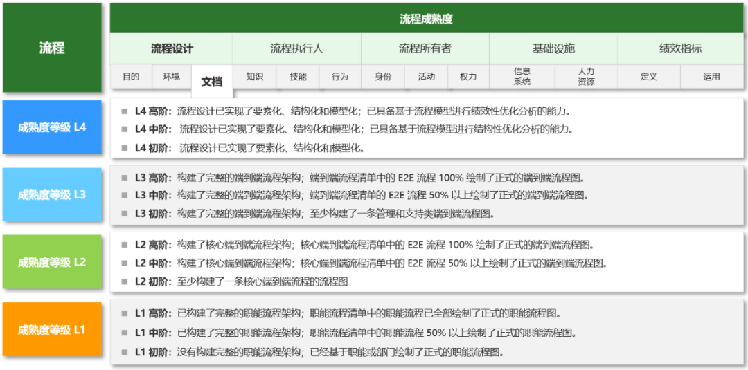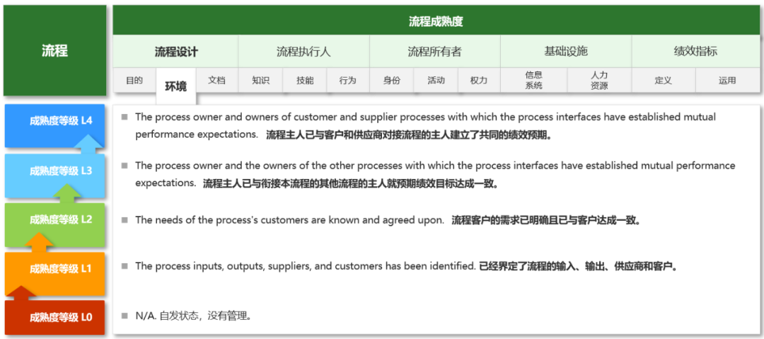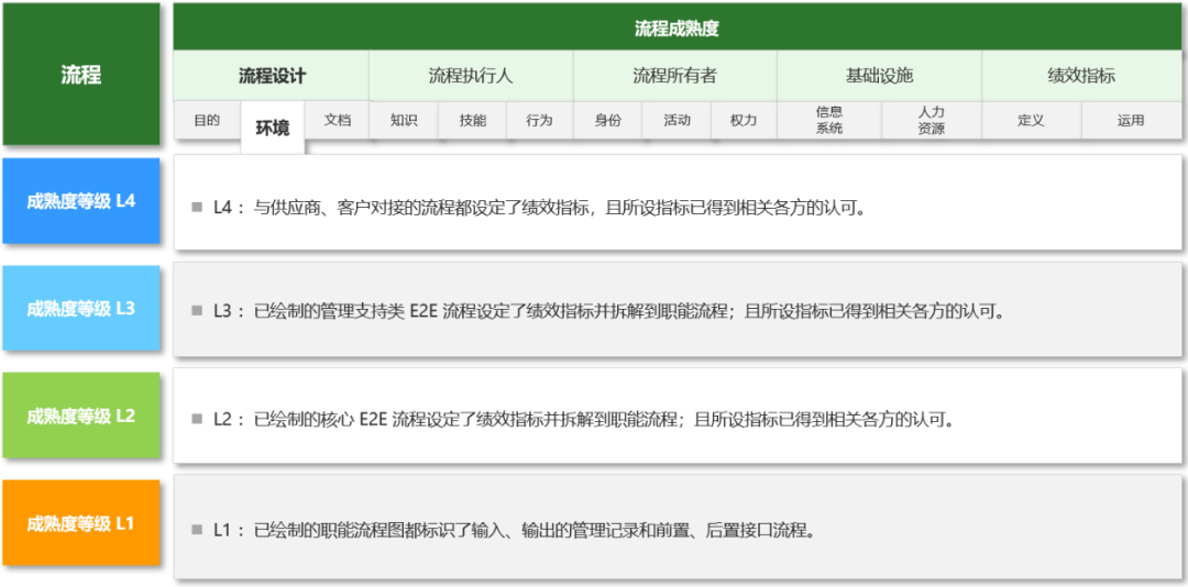 “环境” 各级别初、中、高阶的衡量标准都是对照 “文档” 进行检视。比如,“文档” 达到 L1 中阶标准时,则检视这些已经正式绘制的 50% 以上的职能流程图中是否都标识了输入、输出的管理记录;前置、后置的接口流程。如果都标识了,则说明 “环境” 也达到 L1 中阶了,如果没有标识,则说明 “环境” 仍为 L1 初阶。同样,哪怕只有一条职能流程标识了输入、输出的管理记录;前置、后置的接口流程,也达到了 “环境” L1 初阶。