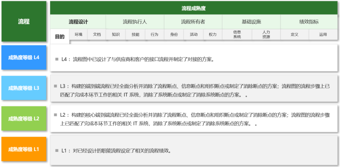 同样, “目的” 各级别初、中、高阶的衡量标准都是对照 “文档” 进行检视。比如,“文档” 达到 L1 中阶标准时,则检视这些已经正式绘制的 50% 以上的流程图中是否都设定了绩效指标。如果都设定了,则说明 “目的” 也达到 L1 中阶了,如果没有都设定,则说明 “目的” 仍为 L1 初阶。同样,哪怕只有一条职能流程设定了绩效指标,也达到了 “目的” L1 初阶。