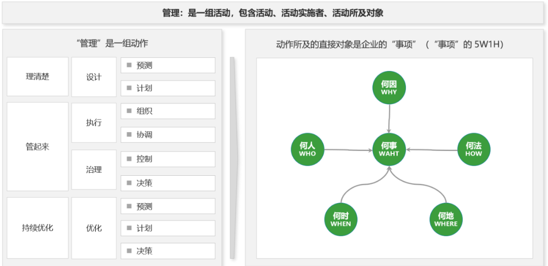 如上图所示,预测、计划、组织、协调、控制和决策这组动作是对 “管理” 这个动词的细分,涵盖了工作 “事项” PDCA(设计、执行、治理和优化)这一生命周期的全过程。EBPM 全要素管理方法论将这一完整的过程进一步提炼为 “理清楚”、“管起来” 和 “持续优化” 三个阶段。