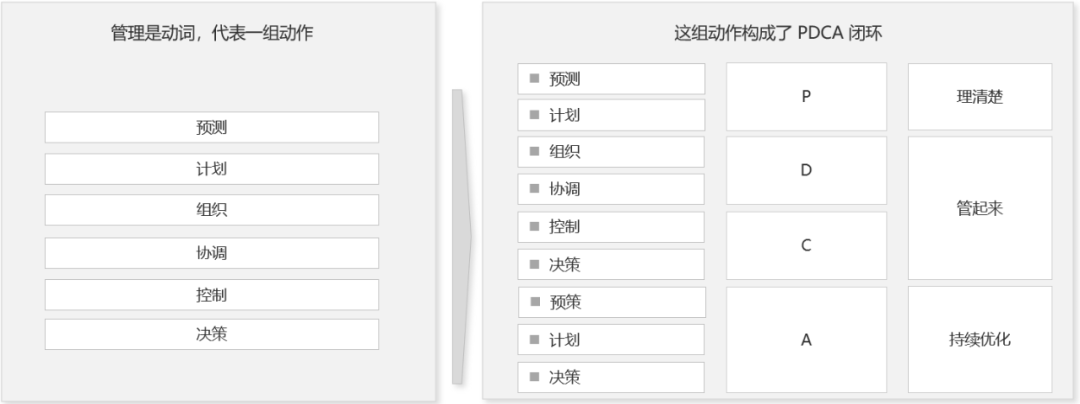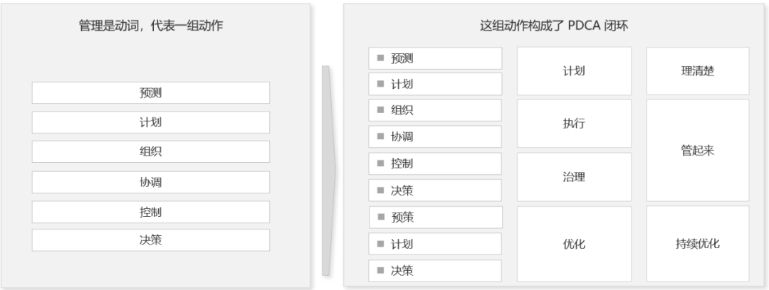 管理就是组织通过预测、计划、组织、协调、控制和决策等活动对工作事项进行计划、执行、治理和优化的闭环过程。