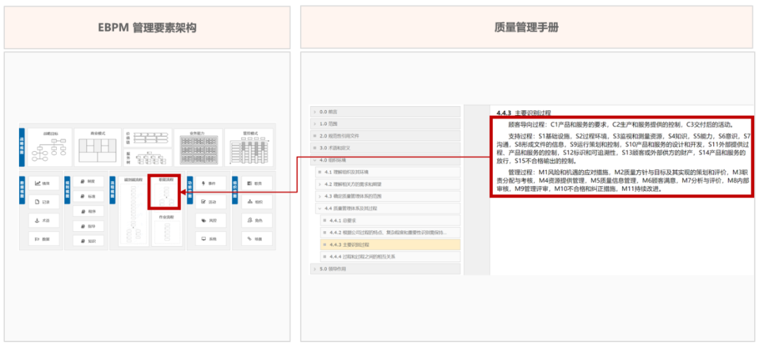 如上图所示,同一份《质量管理手册》中 4.4.3 主要识别过程中的内容,描述的是 “职能流程” 这一类要素。