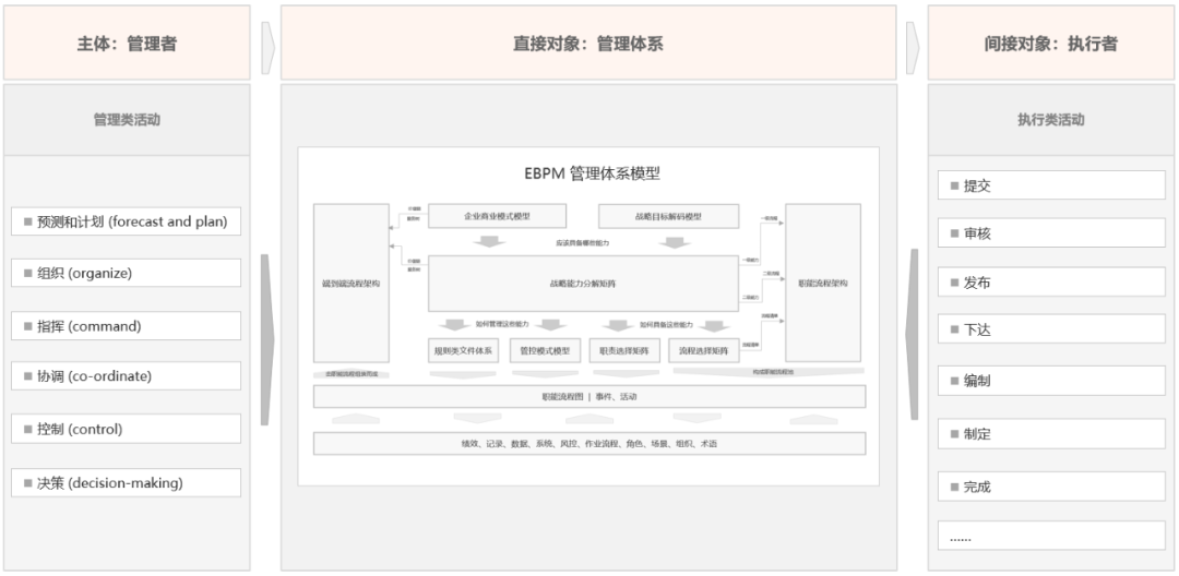 EBPM 全要素流程管理方法论认为:管理体系是组织用于建立方针、目标以及实现这些目标的过程的相互关联、相互作用的一组管理要素所构成的统一的整体;是组织开展预测和计划、组织、指挥、协调、控制、决策等闭环管理活动的直接对象。(详细说明参见《管理体系:管理要素构成的整体(下)》)