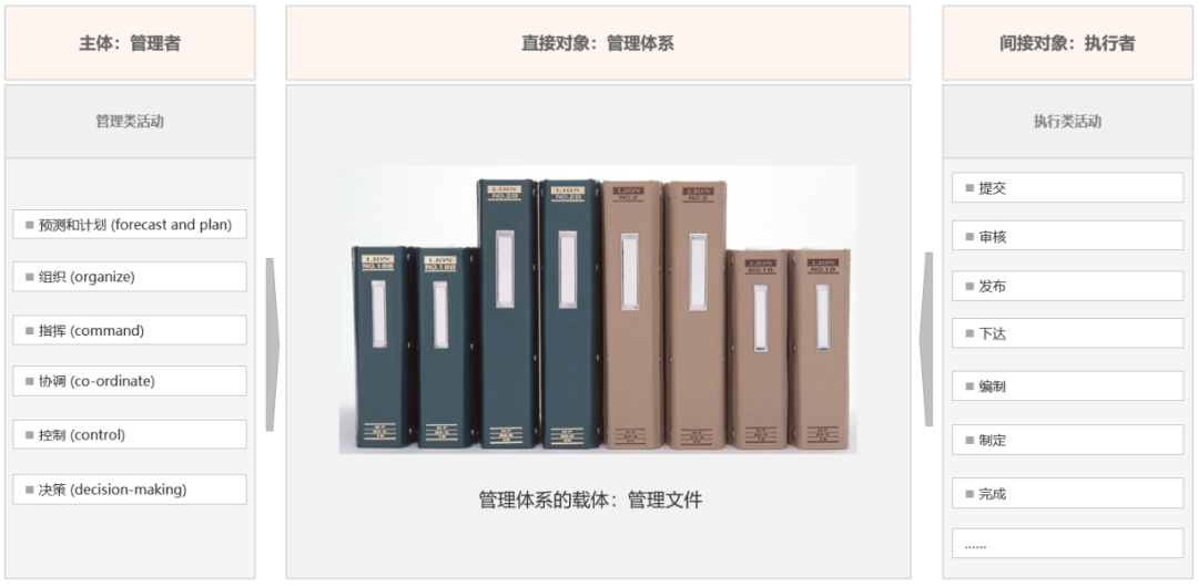 如上图所示,由于现在企业管理体系的载体通常是一份份的文件,所以将文件和文件条款理解为 “要素” 也没有什么问题。确实,一个个条款,一份份文件构成了企业的管理体系。