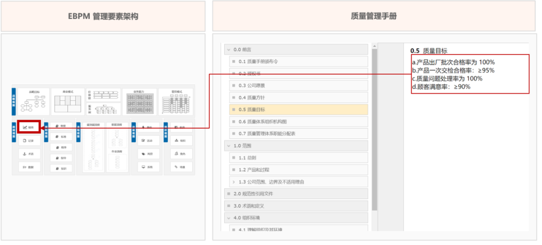 上图所示是某组织的《质量管理手册》,其中《质量目标》这一条款就是由 “绩效指标” 这类要素构成的。