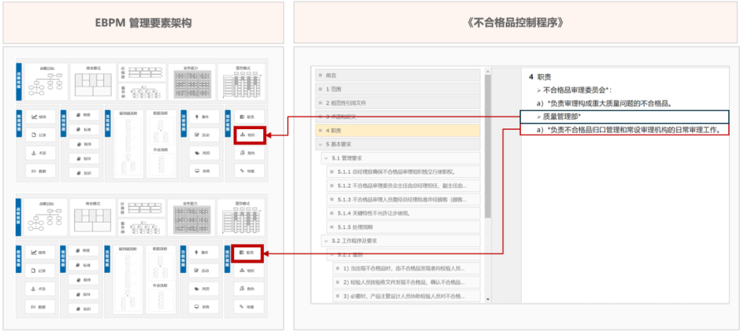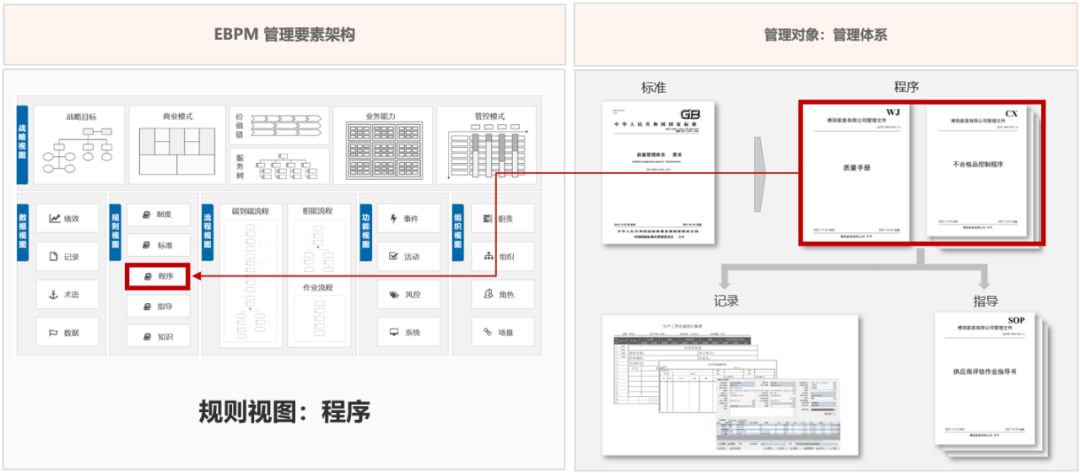 如上图所示,《质量手册》、《程序文件》属于 EBPM 26类管理要素规则类文件中的 “程序” 类要素。