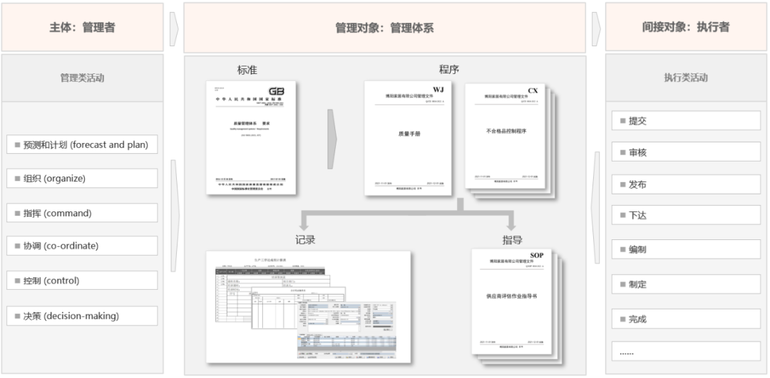 如上图所示,管理就是管 “体系”(《管理就是管体系》)。管理体系是 “管理” 这组动作所及的直接对象。《ISO9000:2015 质量管理体系 基础和术语》中对于体系、管理体系和质量管理体系的定义如下: