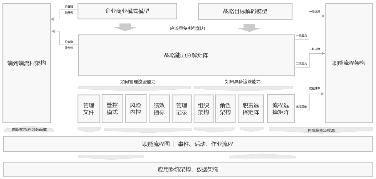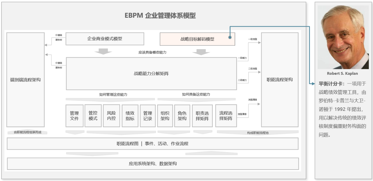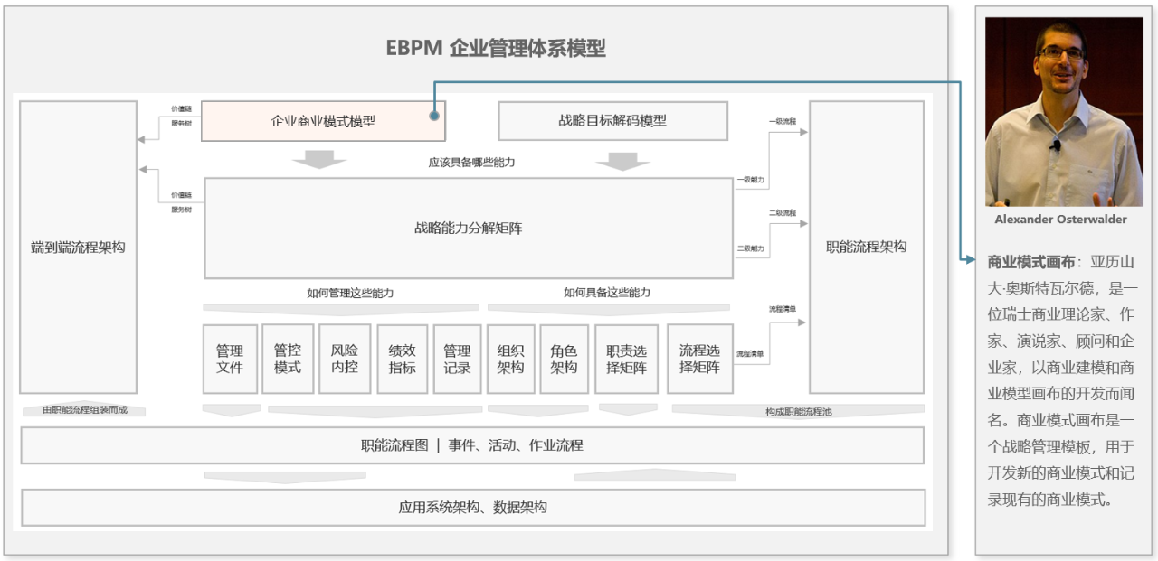 可以认为《EBPM 企业管理体系模型》主要阐述了《业务架构》的构建方法,然后用《应用系统架构》和《数据架构》进行承接。