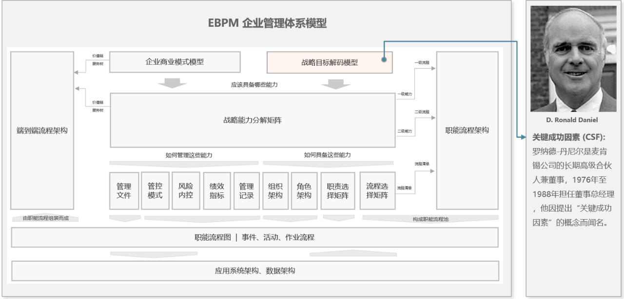 《战略目标解码模型》中融合了关键成功因素 (CSF) 这一重要的战略目标解构方法,此方法是由罗纳德-丹尼尔先生提出的,他是麦肯锡公司的长期高级合伙人兼董事,1976年至1988年担任董事总经理。