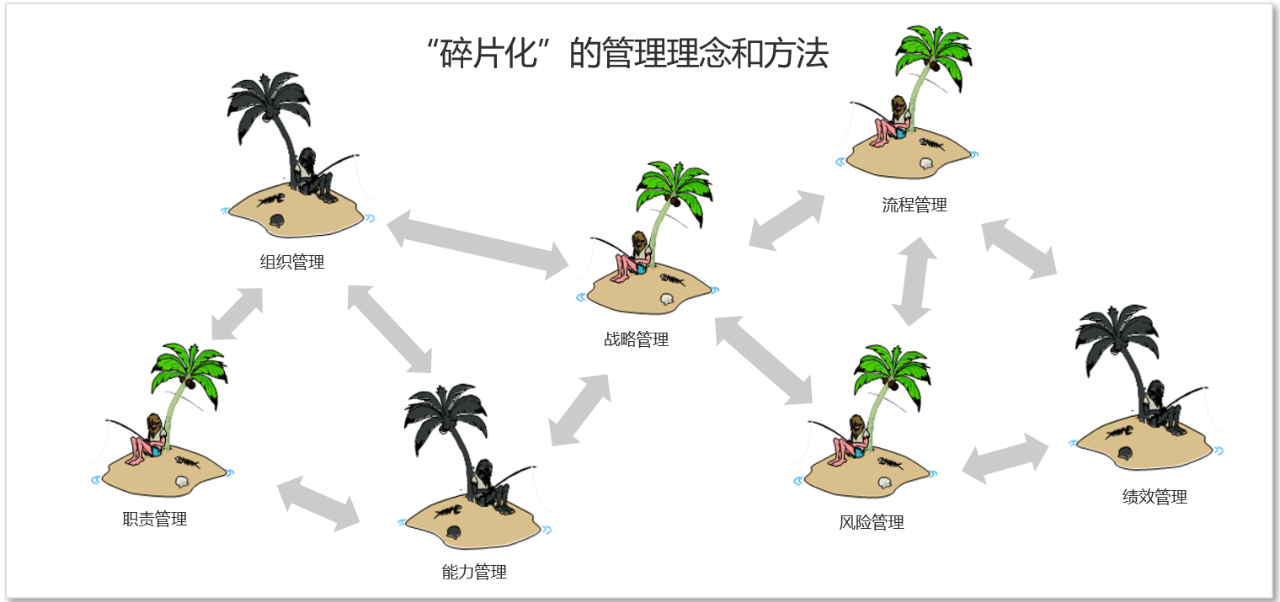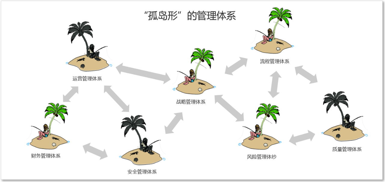 如上图所示,企业在发展过程中会引入各种管理理念和方法,构建各类管理体系。这些理念、方法和管理体系,往往自成一体,从而形成 “碎片化” 和 “孤岛化”的态势。对于管理者来说,渐成乱麻一团;对于执行者来说,往往无所适从。这当然不是引入这些理念,构建这些体系的初衷。