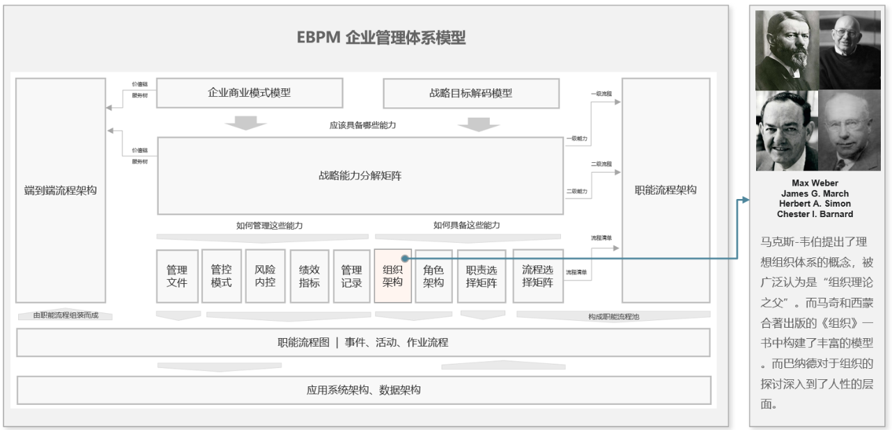 马克斯-韦伯提出了理想组织体系的概念,被广泛认为是“组织理论之父”;詹姆斯-马奇和赫伯特-西蒙合著出版的《组织》一书中构建了丰富的模型;而切斯特-巴纳德对于组织的探讨深入到了人性的层面。EBPM 方法论结合上述理论及组织管理方法的最新发展,提出了《组织架构模型》的构建方法。