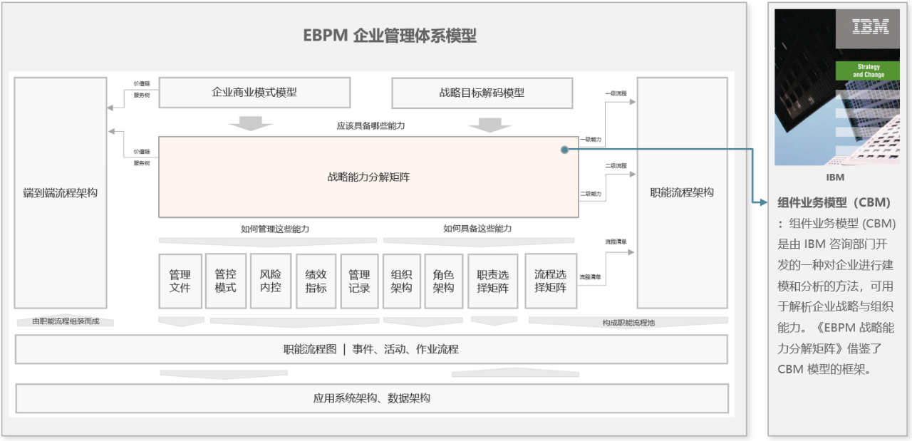 组件业务模型(CBM):IBM 咨询部门开发的一种对企业进行建模和分析的方法,可用于解析企业战略与组织能力。《EBPM战略能力分解矩阵》借鉴了 CBM 模型的框架。