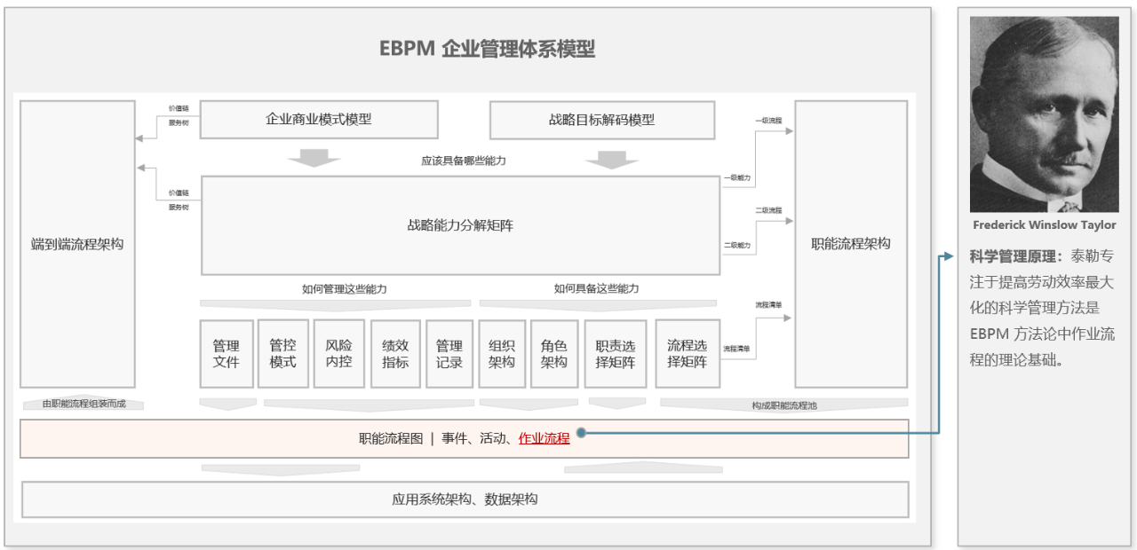 《科学管理原理》中,泰勒专注于提高劳动效率最大化的科学管理方法是 EBPM 方法论中作业流程梳理和构建的理论基础。