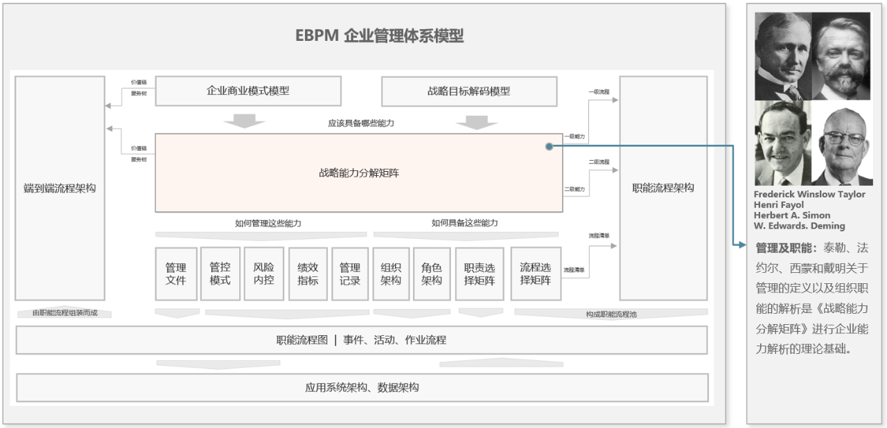 可以这么说,《战略能力分解矩阵》的“形”来自于IBM 的 CBM模型,“神”源自泰勒、法约尔、西蒙和戴明等先哲的思想。《战略能力分解矩阵》是从战略到执行的关键节点,也是 EBPM模型中“形神兼备”的华彩乐章。