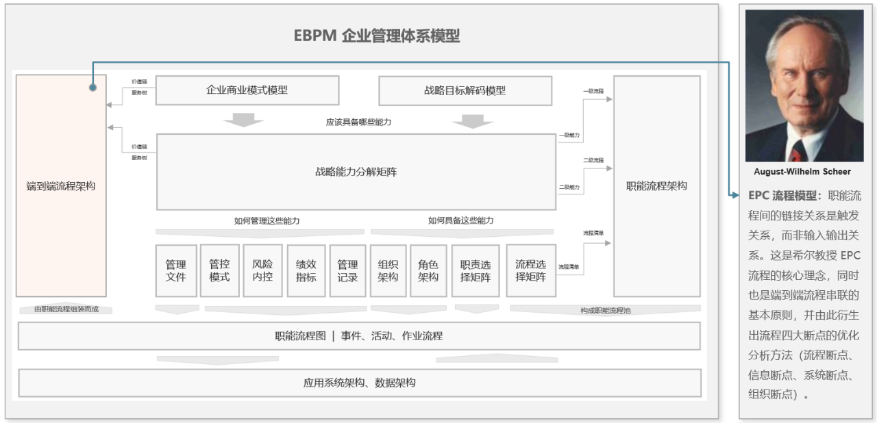 希尔教授(Prof. Scheer)以其提出和发展的房式结构 (ARIS) 模型和 EPC 流程模型闻名,是世界著名的流程管理大师。EBPM 方法论中,基于希尔教授的理论提出了《职能流程架构》的构建方法,以及《EPC 职能流程图》的绘制规则。其中,EPC(事件驱动的流程链)阐述了流程驱动的底层逻辑是触发关系,而非输入输出关系。这也是数字化流程引擎的驱动逻辑。