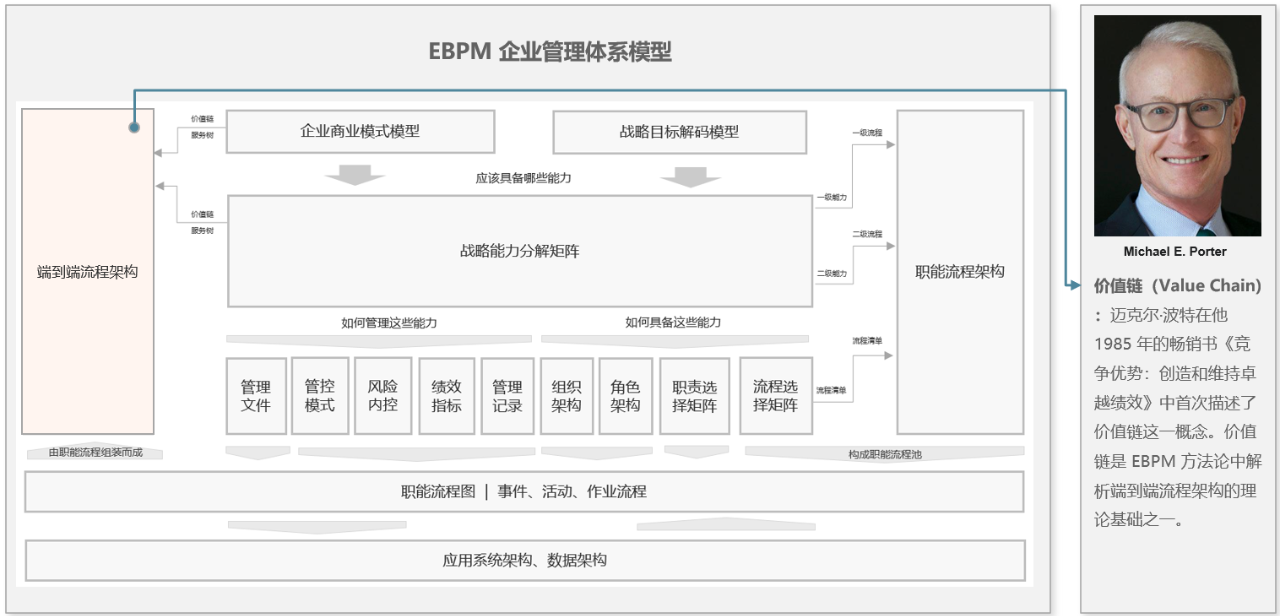 价值链(Value Chain):迈克尔·波特在他1985 年的畅销书《竞争优势:创造和维持卓越绩效》中首次描述了价值链这一概念。价值链是 EBPM 方法论中解析端到端流程架构的理论基础之一。