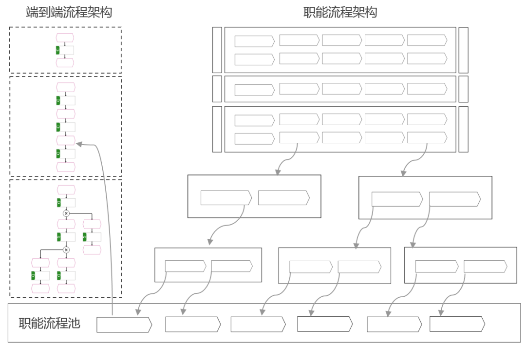 如果不是将所有职能流程名称放在一张大图上进行连线,那应该如何拆分?在流程管理理论的发展过程中,基于“端到端流程”进行拆分逐渐成为一个共识。即应按“端到端流程”这个颗粒度来可视化的展现相关流程之间的关系。