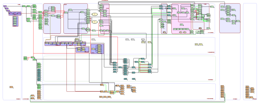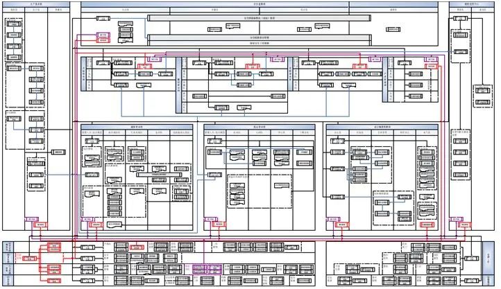 早期流行一种流程勾稽图,上图所示是用VISIO 绘制的流程勾稽图。所谓流程勾稽图就是将所有流程 (图中每一个块是一条职能流程的名称) 按分类分布到一张大图上,然后通过连线将流程连接起来以呈现流程和流程之间的关系。