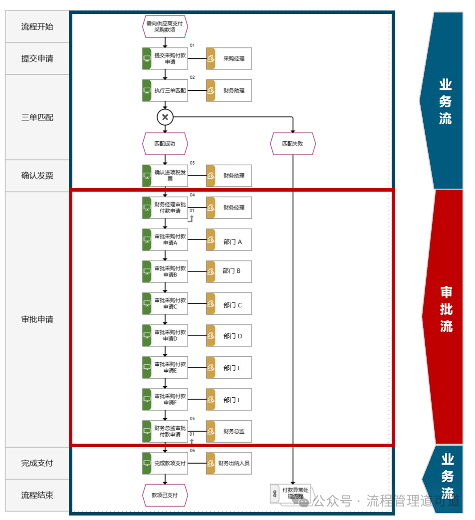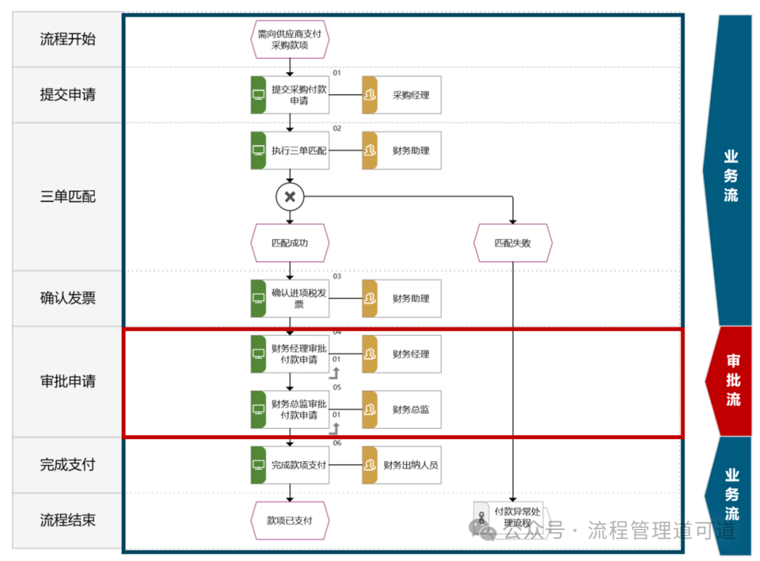 上图所示是一条完整的《采购付款流程》,由 “业务流” + “审批流” + “业务流” 三段构成。