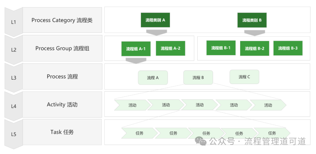 对照上图所示的 APQC 流程框架,“L3:业务流程” 的下一级是 “L4:业务活动”,而 “L4:业务活动” 的下一级是 “L5:业务任务”。“业务流” 和 “审批流” 都属于 “L4:业务活动”,“业务流” 是执行类的活动;“审批流” 是决策类的活动。