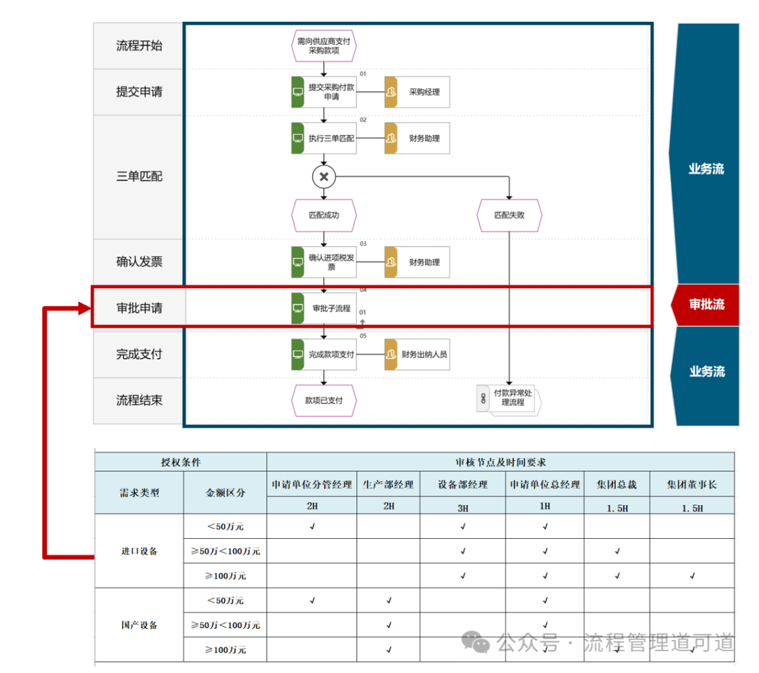 在实操中,很多企业的流程图和授权表是分开描述和维护的,甚至还是不同的人维护的,这是典型的 “两张皮” 现象,人为的将一条完整 “业务流程” 的描述割裂成不同的互不关联的两个“文件” 或者 “模型”。这种做法应坚决杜绝,必须在同一个流程模型中完整描述这两部分信息,简单来说就是《采购付款审批授权表》必须直接关联到 “XX审批子流程” 这个符号上。