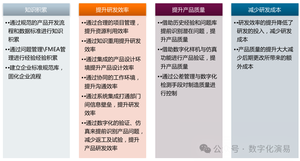 将研发流程优化与PLM平台应用进行有机结合,可在知识积累、研发效率提升、产品质量提升、研发成本减少等方面实现相应的业务价值,具体参见下图2: