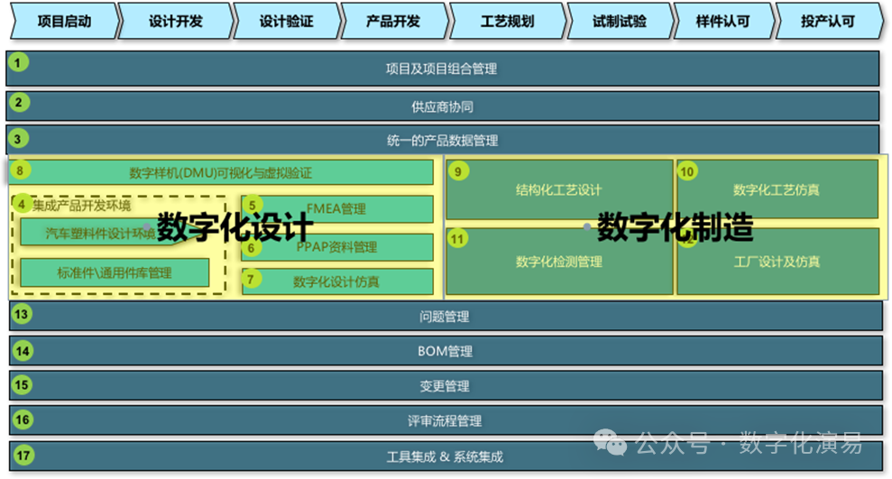 借助PLM平台的实施和应用,实现研发流程的标准化、线上化、可视化,以及部分研发作业的自动化。PLM平台的功能框架,可参加下图1所示: