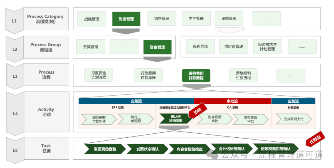 上图中 L4 级活动<确认进项税发票> 往下展开是完成此项工作的具体任务构成的流程,EBPM 方法论将 L5 级流程称为 “作业流程”。关于 “活动” 和 “任务” 的区别以及 L4 和 L5 级流程的划分规则,后续另行撰文进行探讨。