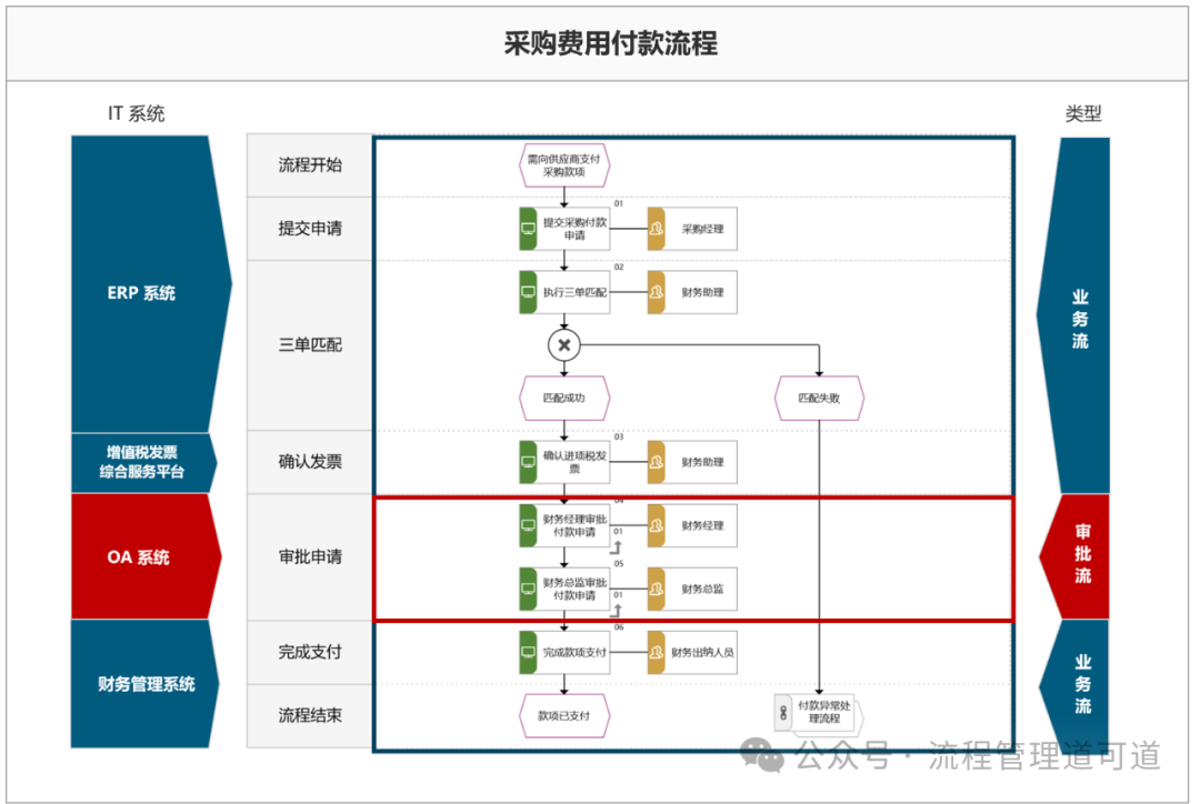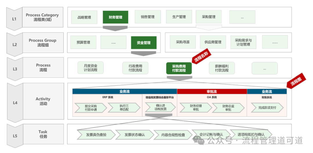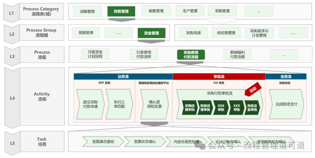 可以看到流程名称《采购费用付款流程》是属于 L3(流程),由 “业务活动” 构成的流程图是属于 L4(活动);而某一个具体的 “活动” 再往下细化展开是 L5(任务)。