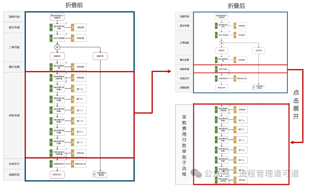 如上图所示,不管是不是进行折叠处理,“审批流” 的《审批路径图》还是需要进行可视化建模的,至于是否折叠处理,可基于 L4 流程图的复杂度进行灵活处理。这里需要强调的是,《审批路径图》中的 “业务活动” 应是所有可能发生的 “审批活动” 的全集,尽管某些业务场景下只会完成这个全集中的部分 “审批活动”。