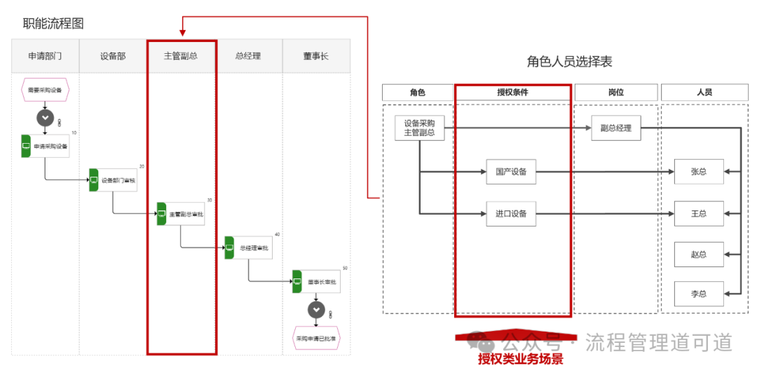 上图所示的 <设备采购申请流程> 中有一个 <主管副总审批> 环节,这个活动分配了一个角色 “设备采购主管副总”。如上图右侧所示,这个角色分配了一个岗位 “副总经理”。然而,“副总经理” 这个岗位中有4个人。那么,<设备采购申请流程> 中完成 <主管副总审批> 这个活动的人究竟是这 4 人中的哪位呢?上图右侧所示的《角色人员选择表》中明确了此处的选人规则。