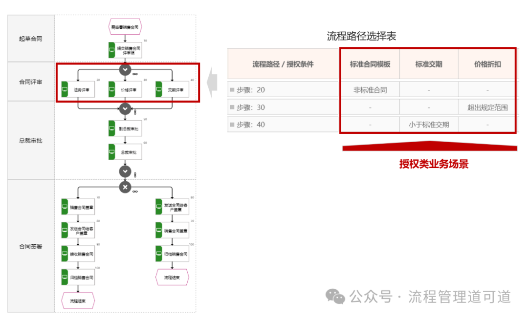上图所示是某企业的《销售合同签署流程》,合同评审阶段的 3 个活动:<步骤 20:法务评审>、<步骤30:价格评审>、<步骤40:交期评审> 构成了另一种类型的流程选择路径,即 “并行活动选择路径”。同样,由于不是所有情况下这三个步骤都需要走,右侧所示的<审批路径选择表>中设定了路径选择的规则,符合特定条件时才需要完成相关的步骤,如果条件不符合,这三个步骤都可以跳过。
