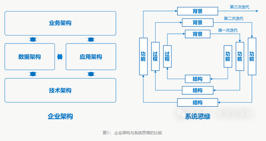 为了理解、应对和驾驭各种形式的复杂化,人们提出了相应的学说和方法,企业架构和系统思维,就是为企业数字化领域的复杂性管理而服务的。如图1所示,是企业架构与系统思维的比较: