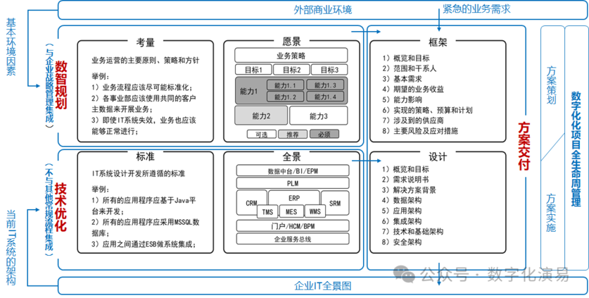 实际上,任何咨询机构的数智化规划方法论,形式上是战略过程模型,起到核心作用的则是企业架构。只有把企业架构的“一体四面”设计好,以此为依据所编制的数智化规划才会有指导性和可行性。
