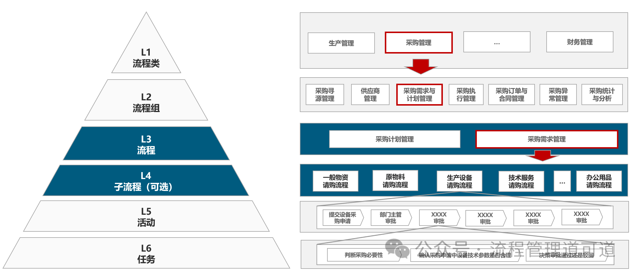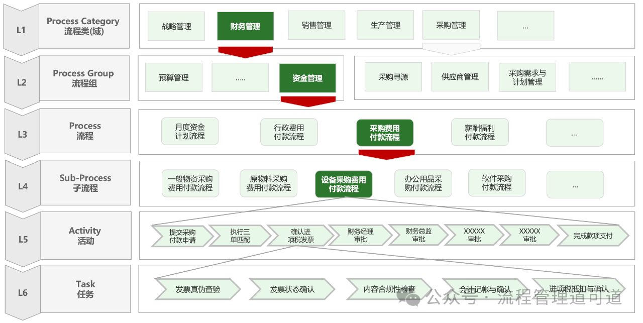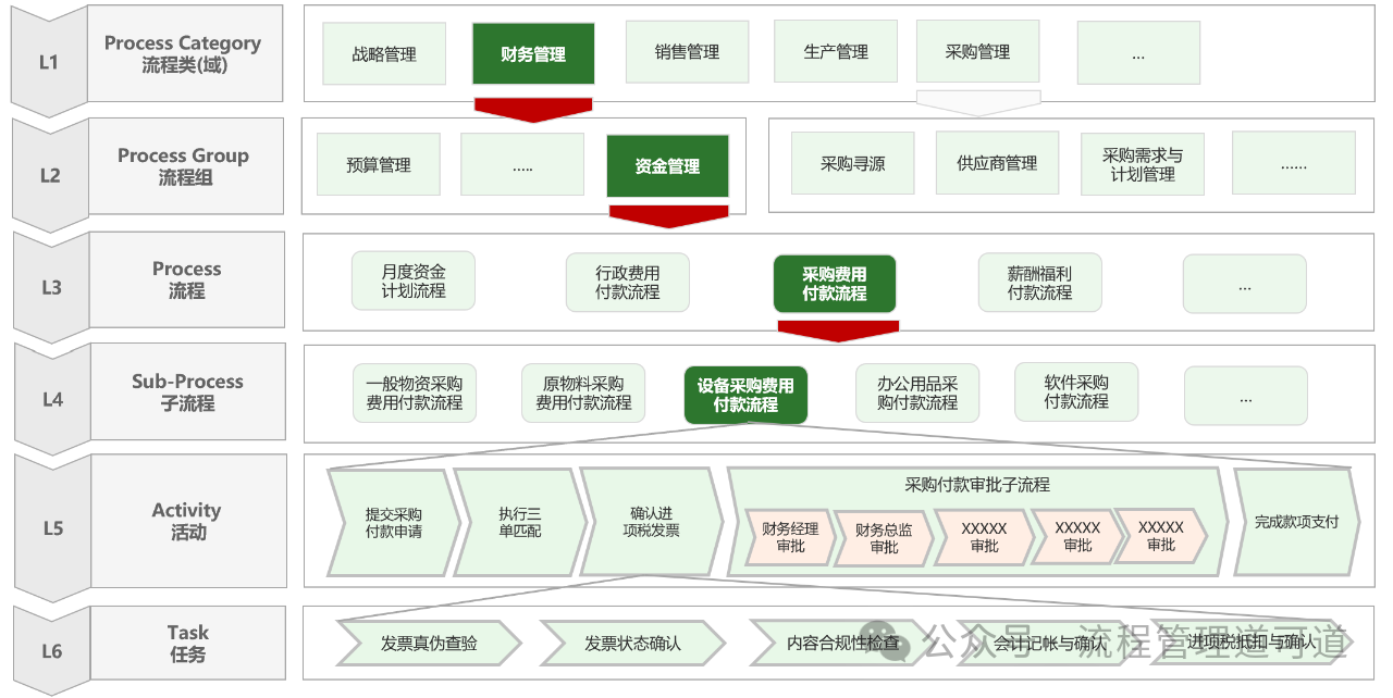 在上图所示的示例中:“L4子流程:设备采购费用付款流程” 是 “L3 流程:采购费用付款流程” 一个具体业务场景下的子流程。