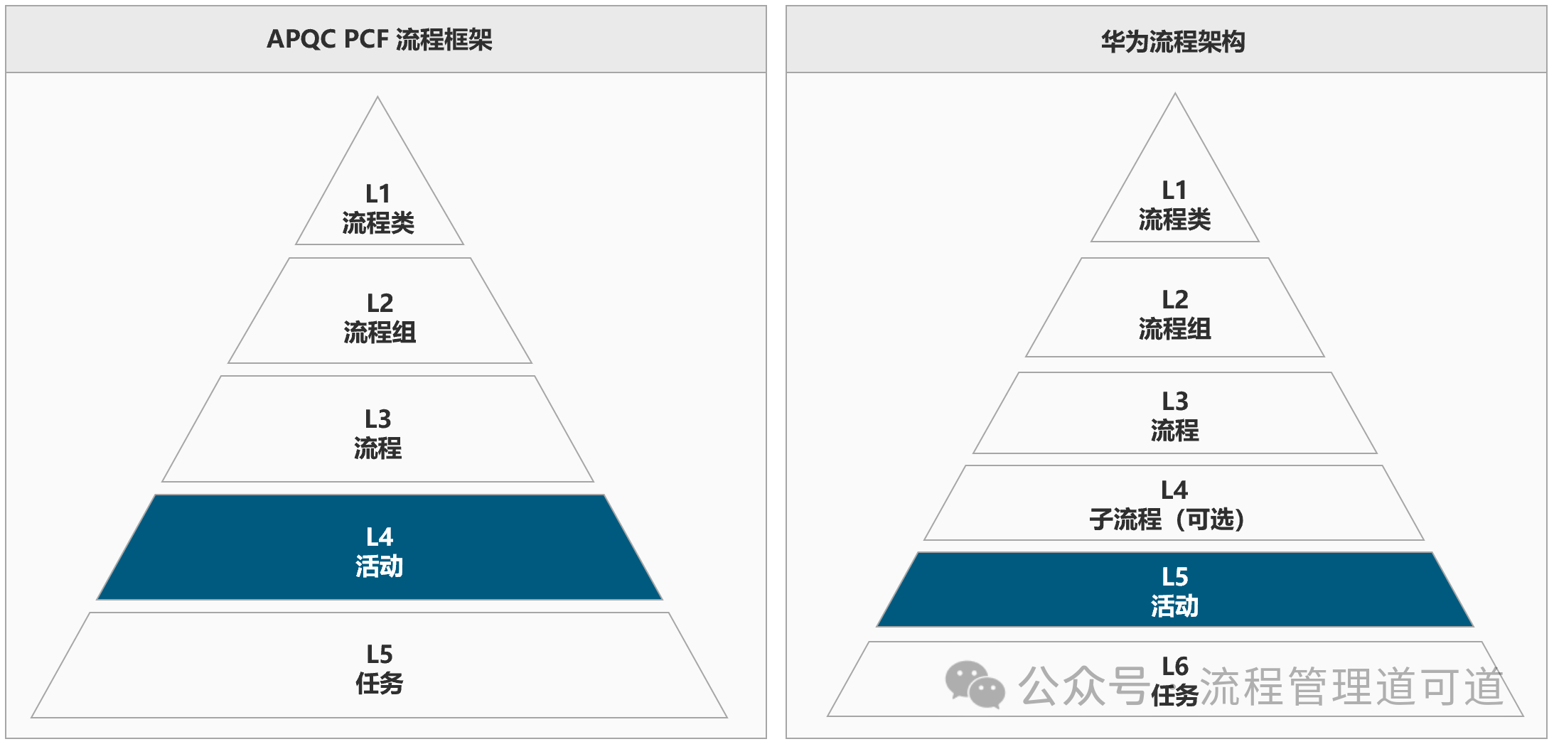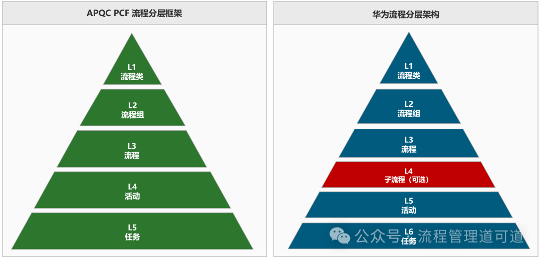 如左上图所示,APQC PCF 流程框架自上而下分为5个层级,分别为:L1 流程类、L2 流程组、L3 流程、L4 活动、L5 任务。按此规范,对于整个流程架构而言,统一都是 5 级。如右上图所示,基于APQC PCF 框架,华为等企业在 "L3流程" 下方又增加了一层:"L4 子流程",同时又注明这一层是可选的。所谓可选,就是有的 “L3 流程” 往下直接展开为 “L5活动”;有的“ L3 流程” 先展开为 “L4 子流程”,然后再往下展开为 “L5 活动”。这样,在整个流程架构中的,有的是 6级有的是 5 级。