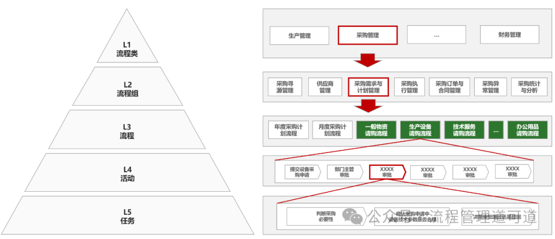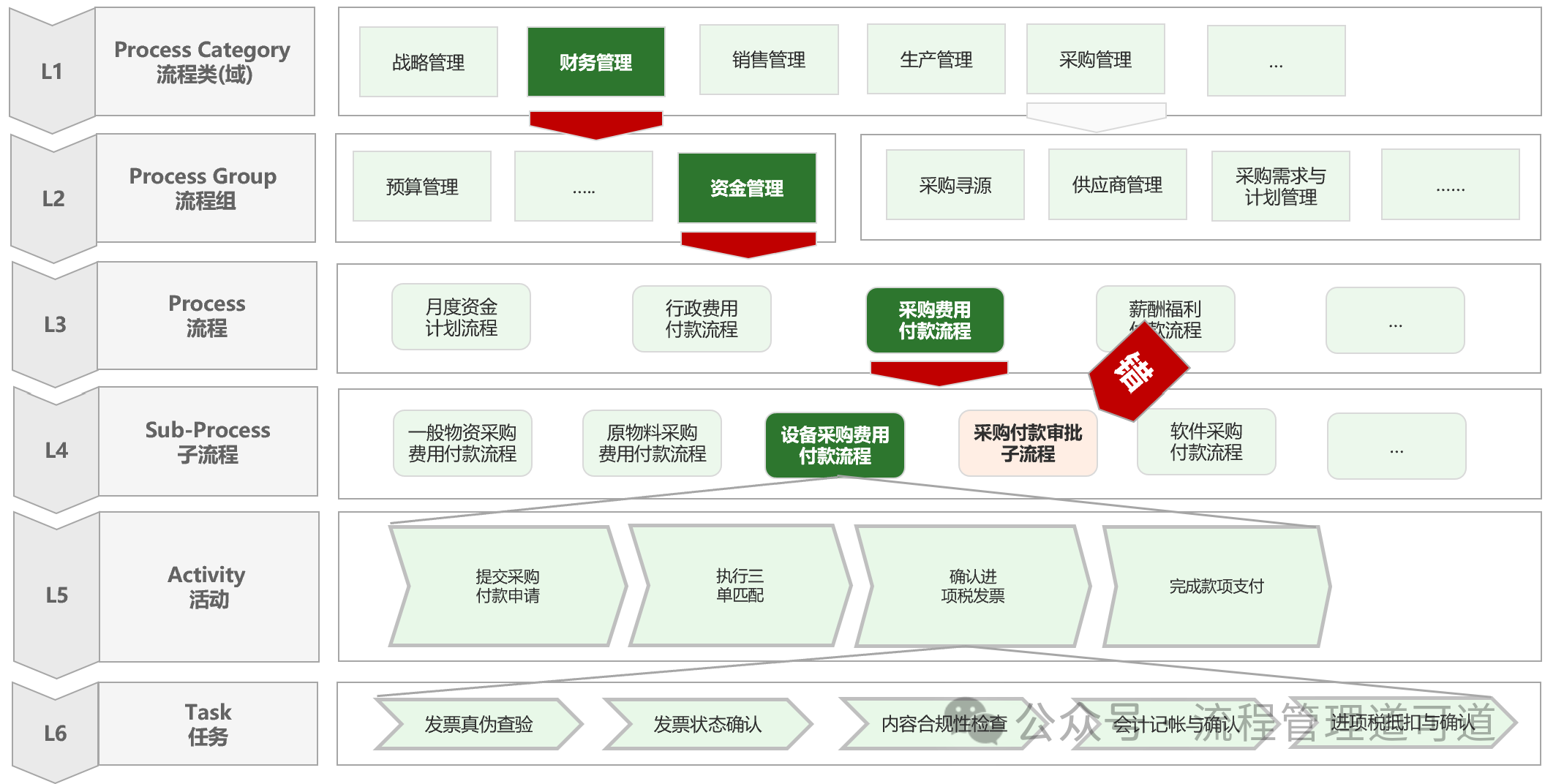 另外,如上图所示,<采购付款审批子流程> 更不可能与上一级即 L4 级 “子流程” 并驾齐驱,成为其中的一员。